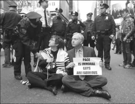 Rabbi Sharon Kleinbaum, left, and Matt Foreman, executive director of the National Gay and Lesbian Task Force, protesting in March for L.G.B.T. rights outside the Times Square military recruiting station. They were both arrested. |
