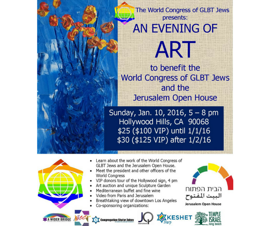 AN EVENING OF ART On January 10th, 2016 in Hollywood Hills, CA, the World Congress of GLBT Jews presented An Evening of Art to benefit the World Congress and the Jerusalem Open House. An opportunity to see work being done around the world, videos were shown from Christophe Girard, the Mayor of the 4th [...]