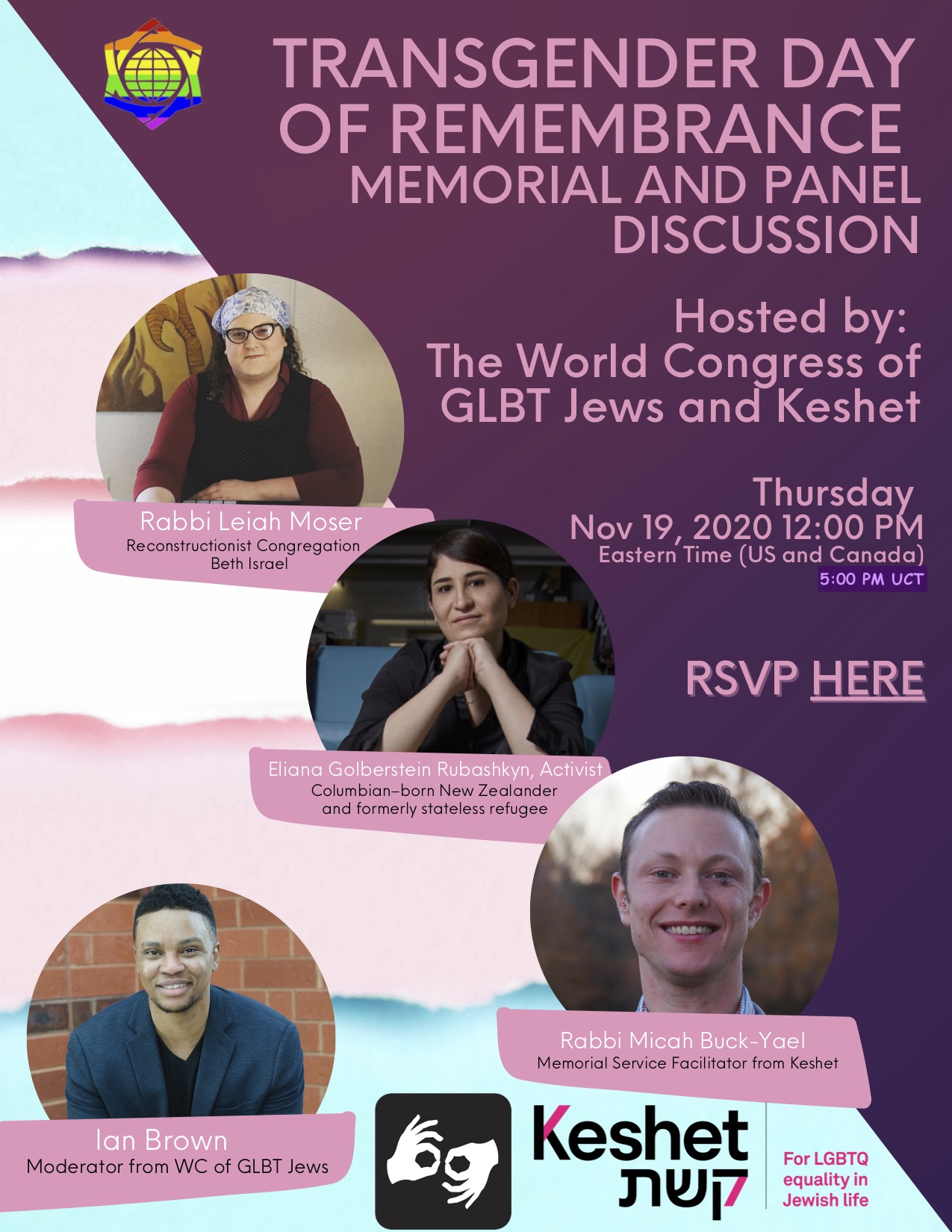 Keshet a virtual Transgender Day of Remembrance Memorial Service and Panel Discussion on Thursday, November 19, 2020.